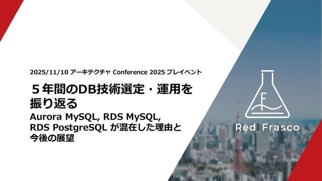 株式会社Red Frascoは、案件を通じて得たアーキテクチャ設計や運用の知見を共有するため、アーキテクチャConference 2025 プレイベントに登壇しました。 本セッションでは、5年間にわたるデータベース技術選定と運用の変遷を振り返りながら、Aurora MySQL、RDS MySQL、RDS PostgreSQL が同時期に共存することになった背景や、そこから得られた学び、今後の構成の方向性について解説しました。 ■テーマ 5年間のDB技術選定・運用を振り返る: Aurora MySQL, RDS MySQL, RDS PostgreSQL が混在した理由と今後の展望 ■スピーカー シニアインフラエンジニア 猪熊 朔也 ■イベント情報 詳細はこちらからご確認ください。 ■セッション資料 詳細はこちらからご確認ください。
